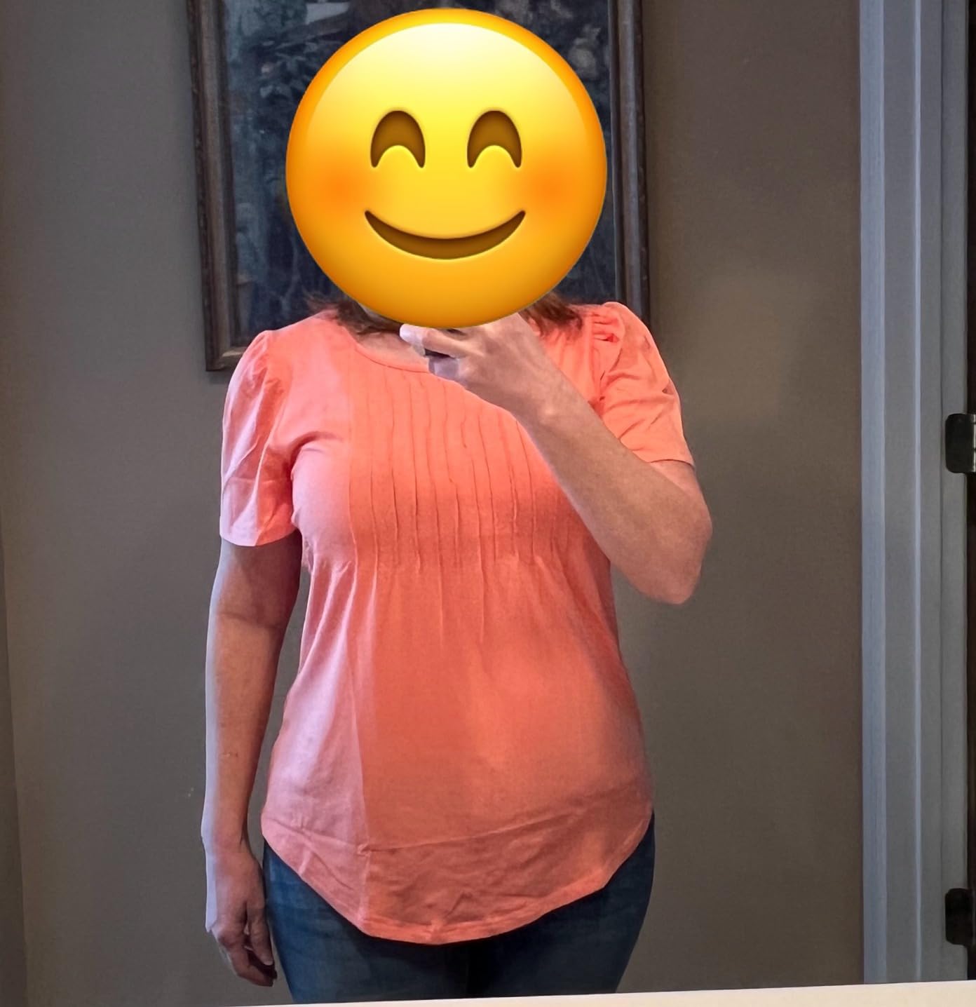 The color is lovely, and the fabric is very soft. The medium fits nicely around the bust, middle and arms (sleeves). If you live in an area with hot summer heat, this will feel comfortable next to your skin. Sweat marks under the arms are to be determined.