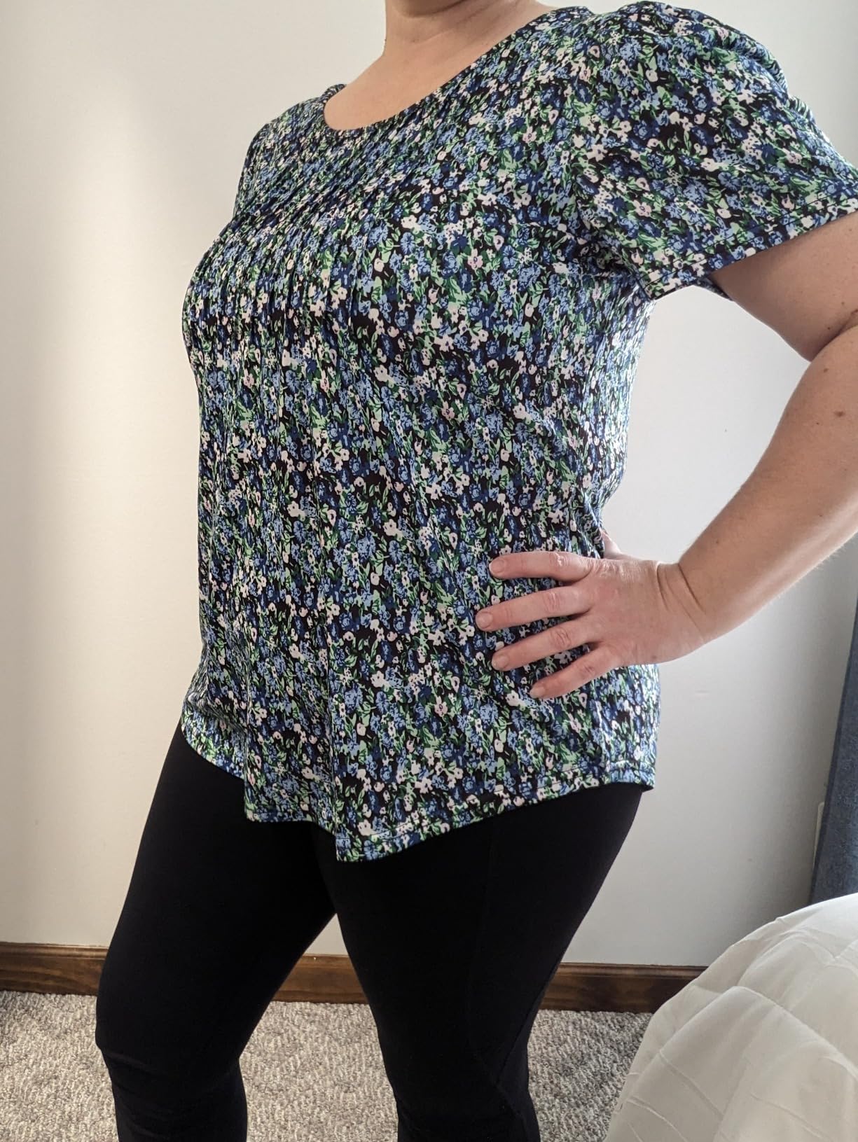 I am an apple shaped, mid-sized curvy girl, 5'5" with waist 38, Hips 46, band 35, bust 42, weight about 190lbs, Bra size 38DDD. I am right on the edge between a size large and an XL, short torso, average inseam. Based on the size chart a Large might have been ok, but I ordered the XL in order to have a bit more room over my tummy. Its a good thing I did. I think the waist measurement really should be a hip measurement. I do like the pleating over the bust which gives it a little shape, and the sleeves have some nice detail. I find the length a little long for me, but that is a common issue for my very short torso. The fabric is soft and a nice weight jersey knit. I do think this particular pattern looks a little matronly. I think I would prefer to order one more size up in a solid color, but overall I think this is a nice shirt.